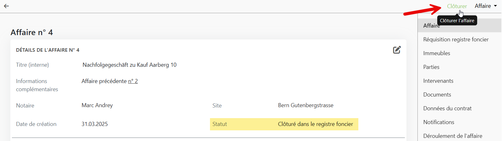 Commencez par clôturer l'affaire au statut « Clôturé dans le registre foncier ». Le passage à ce statut clôture l'affaire également dans Notariat+ et la prépare pour l'archivage.