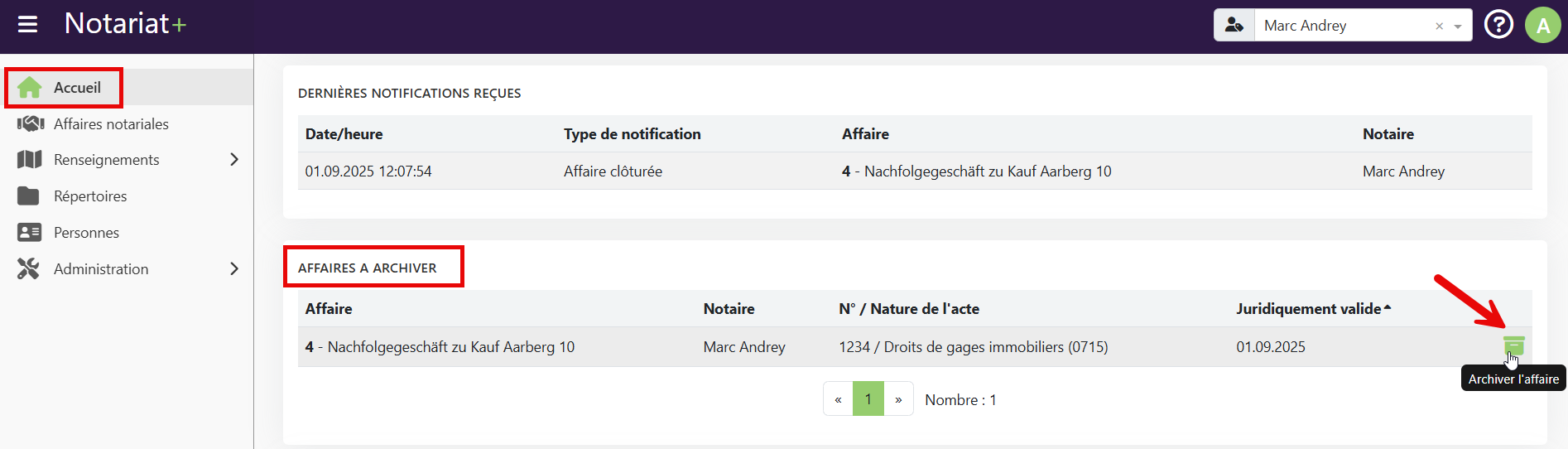 Notariat+ est une plateforme de transmission, mais pas une solution d'archivage. C'est pourquoi les transactions sur Notariat+, et en particulier les actes, doivent d'abord être archivées en externe après leur inscription au registre foncier, puis supprimées.