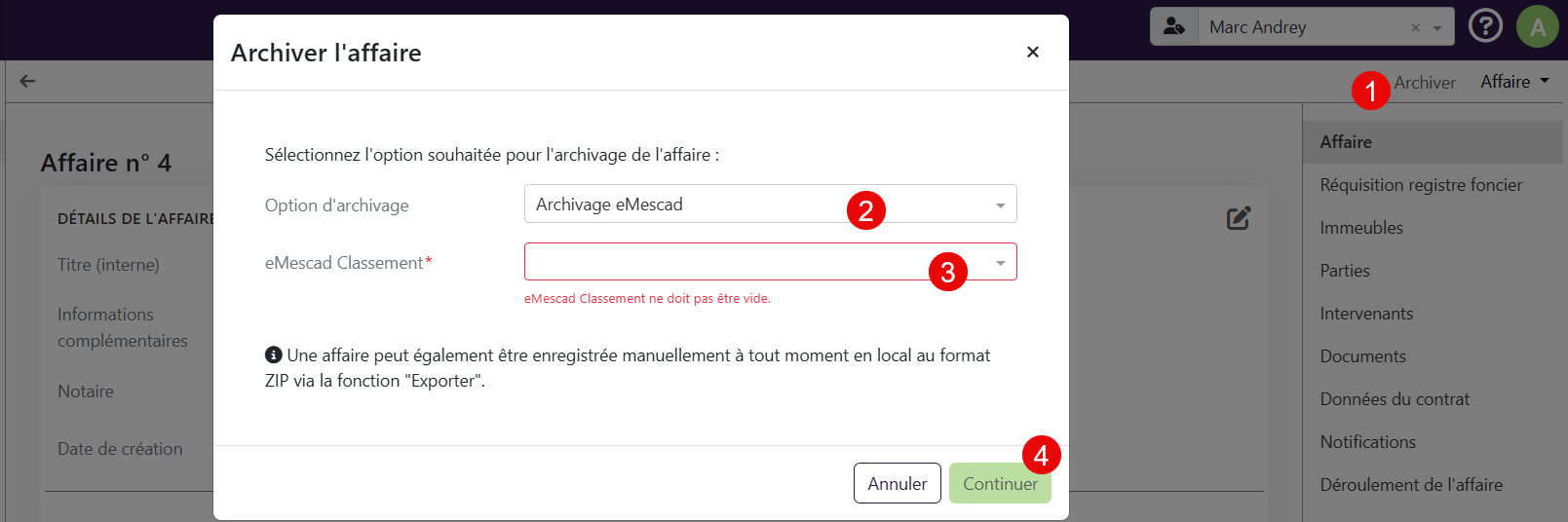 L'affaire passera au statut « Archivage en cours ». Le système effectuera la transmission à eMescad en arrière-plan.